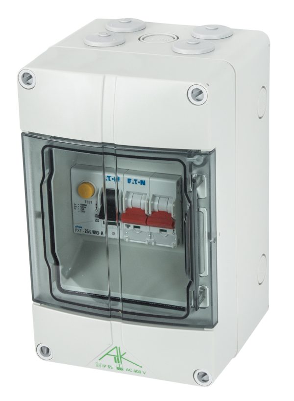 Anschlussfertiger Stromverteiler mit 2 Ausgängen für den Anschluss von zwei Verbrauchern (z. B. Ladegerät und Klimaanlage).