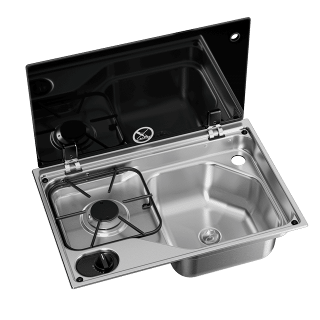 Die Dometic CVC1525G ist eine kompakte Kombination aus Gaskochfeld mit einem Brenner und rechtsseitigem Spülbecken, die eine komfortable Küchenausstattung für Reisemobilküchen bietet. Dank der ergonomisch angeordneten Bedienknöpfe haben Sie alle Kochvorgänge perfekt im Griff. Wenn keine Töpfe auf dem Kochfeld stehen, können Sie die Glasabdeckung schließen, um zusätzliche Arbeitsfläche zu gewinnen – und gleichzeitig Ihr Kochfeld zu schützen. Die Kochfeld-Spüle-Kombination wird flächenbündig in die Arbeitsplatte eingebaut. Siphons und Wasserhähne sind separat erhältlich (Sie können z. B. den Dometic Wasserhahn AC539 und den Siphon AC530 verwenden). Das passende Hahnloch ist bereits vorgebohrt.