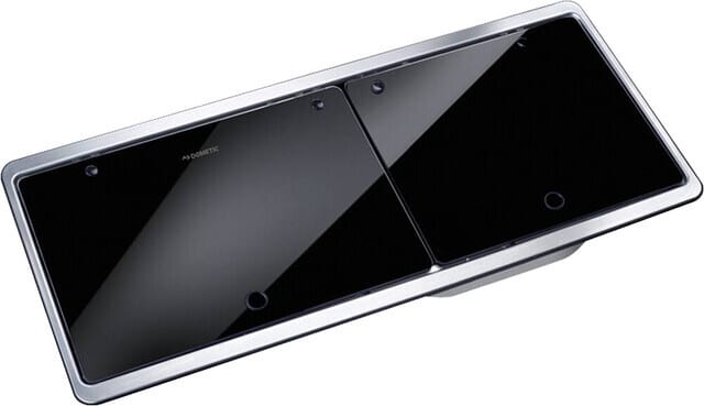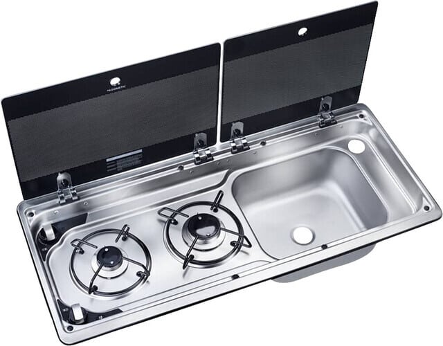 Kombination aus 2-flammigem Kochfeld und Spüle mit Glasdeckel, 760 x 325 mm.