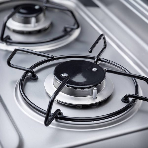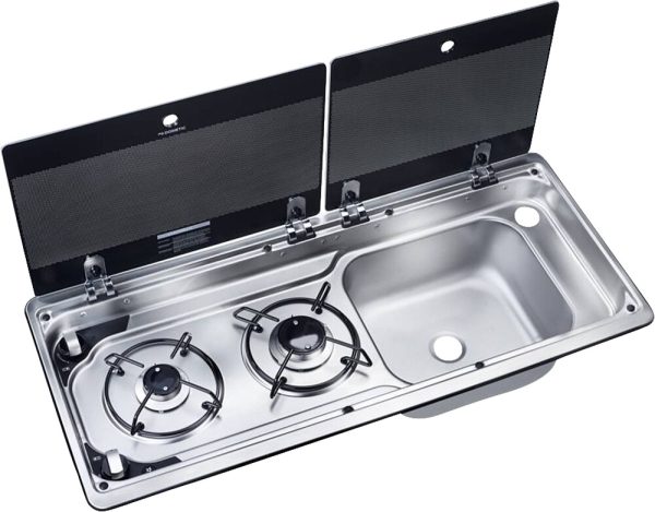 Kombination aus 2-flammiger Kochmulde und Spüle mit Glasabdeckung und elektronischer Zündung.