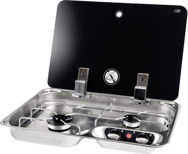 2-flammiger Kocher mit elektronischer Zündung und Glasabdeckung.