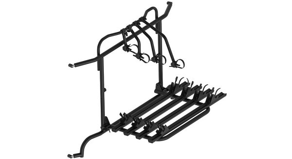 Fahrradträger pulverbeschichtet schwarz zu einfachen Montage an den Türscharnieren. Zum Öffnen der Hecktüren kann der Fahrradträger seitlich nach rechts weggeschwenkt werden. Der Grundträger kann als Hochlader oder mit der optional erhältlichen Beleuchtungsleiste als Tieflader eingesetzt werden.