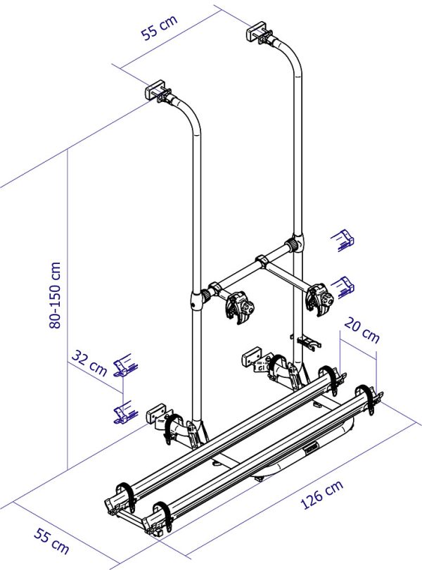 Dieser kompakte Fahrradträger ist geeignet für Vans mit Doppelhecktüren und für Fahrzeuge mit gebogenen hinteren Wand dank eines 4-Punkt-Befestigungssystem. Es wird mit Schrauben und Befestigungsplatten durch die Tür montiert. Der erhöhte Abstand von 20 cm zwischen den Schienen ermöglicht eine einfache Last der Fahrräder. Die Türen können mit geladenen Fahrräder geöffnet werden.