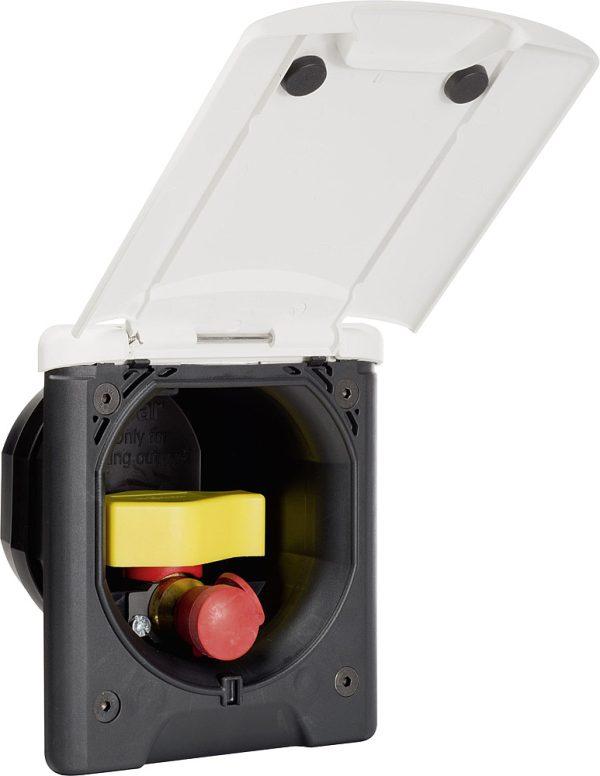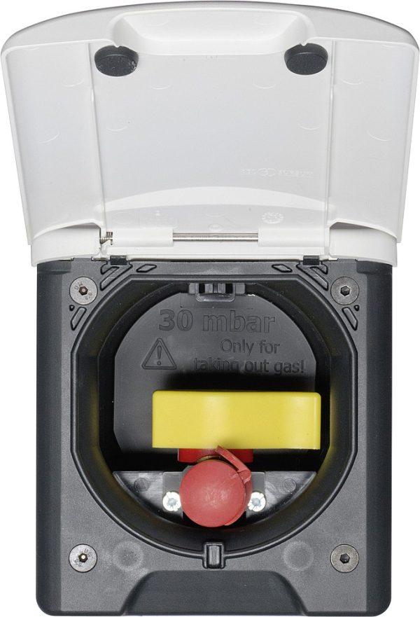 Klappdeckel (UV-beständig) mit Magnetverschluss. Leicht zugänglicher Absperrhahn.