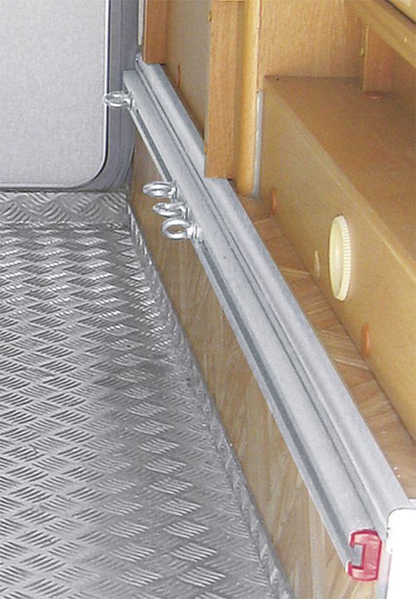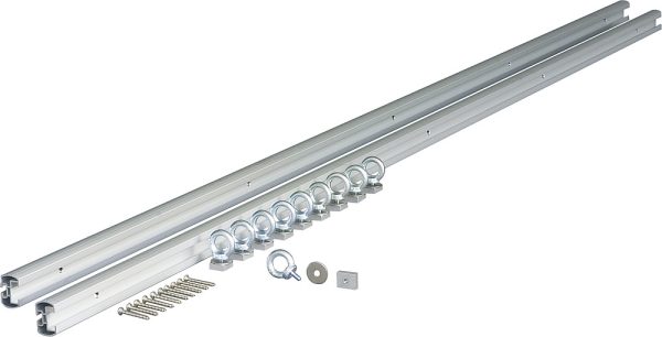 Eloxierte Aluminiumschienen für die Befestigung an der Fahrzeugwand der Heckgarage. 2 Schienen und je 5 verschiebbaren Ösen, sowie Edelstahl Befestigungsschrauben.