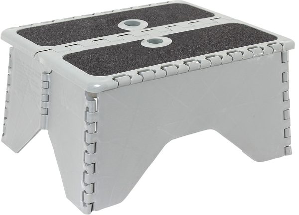 Kompakte Klapptrittstufe für Caravaning, Camping und Haushalt. Robuste, strapazierfähige Kunststoffkonstruktion. Mit rutschfester Trittfläche. Einfach zu falten und verstauen.
