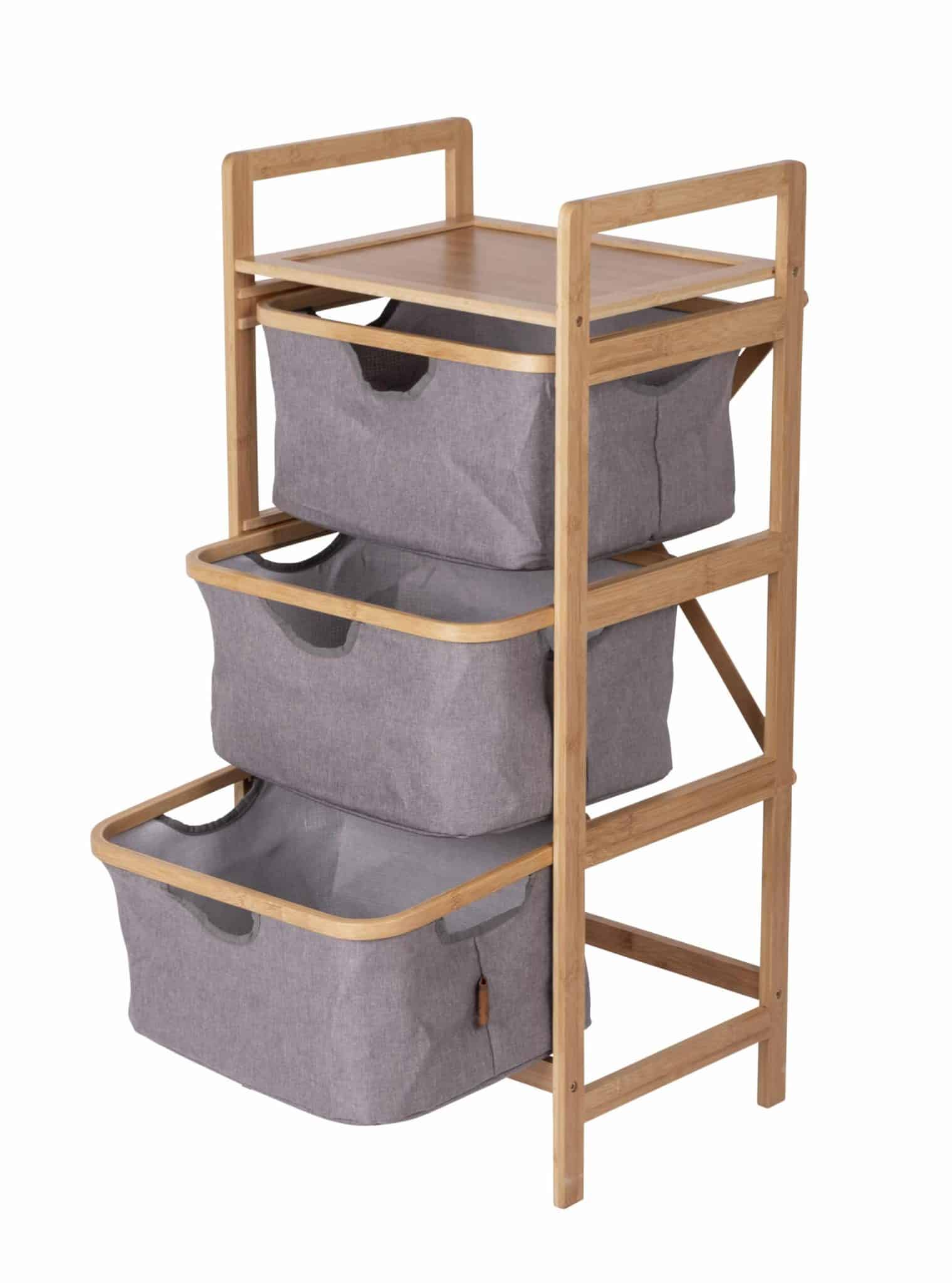 Ein modern gestalteter Campingschrank mit 3 ausziehbaren Körben. Der Schrank hat einen Bambusrahmen und hat sehr schöne Details verarbeitet. Ideal für im Zelt, zu Hause im Bad oder auf dem Balkon.