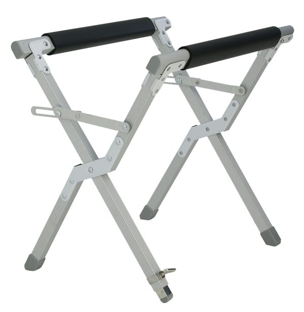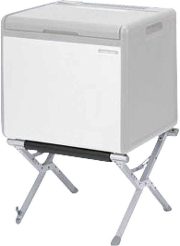 Stabiles Vierkantgestell mit Bodenschonern. Einstellbar in zwei Höhen: 33 x 45 x 50 cm und 44 x 32 x 50 cm (B x H x T). Zum Schutz der Kühlbox sind die Träger weich ummantelt. Unebenheiten können durch einen verstellbaren Fuß ausgeglichen werden.