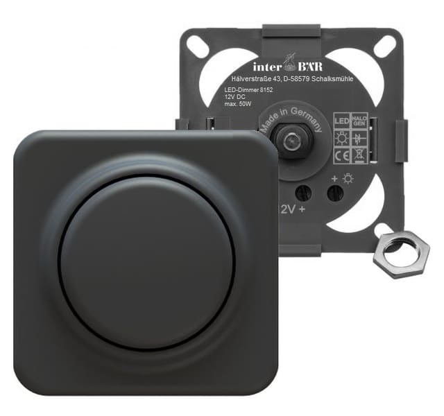 LED-Möbeleinbau-Dimmer Serie 8152, PWM (Pulsweitenmodulation), 10-15 V DC, 50 Hz, max. 50 W, Abdeckungen von Berker und weiteren Herstellern passen auf diesen Dimmer. Geeignet für dimmbare 12 V LED-Lampen, 12 V Glüh- und Halogenlampen, LED-Module und Stripes mit Begrenzungswiderständen, Drehdimmer mit Druck-Wechsel-Schalter, kein Stand-by-Verbrauch durch echten Ein-/Ausschalter, Anschluss mit Schraubklemmen bis 2 x 2,5 mm² (starr).