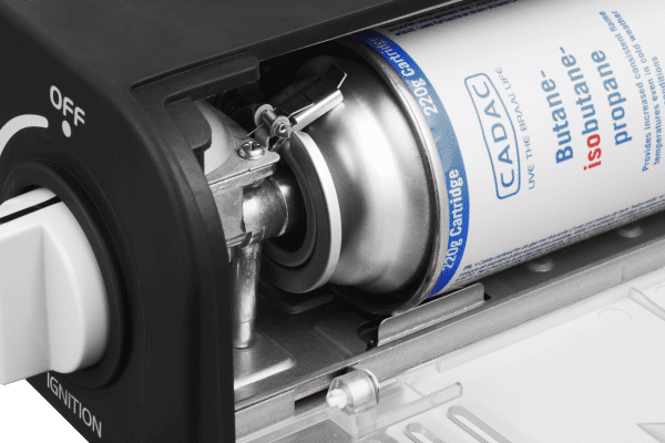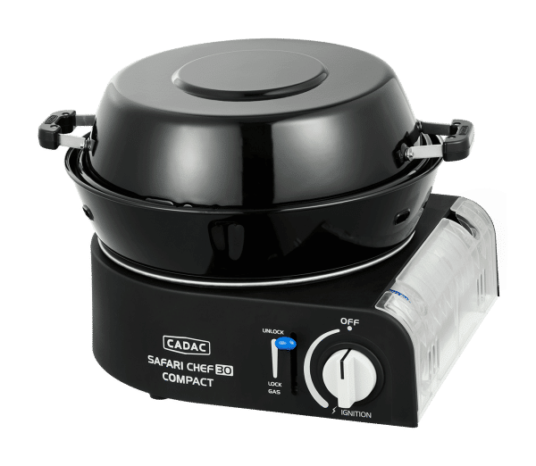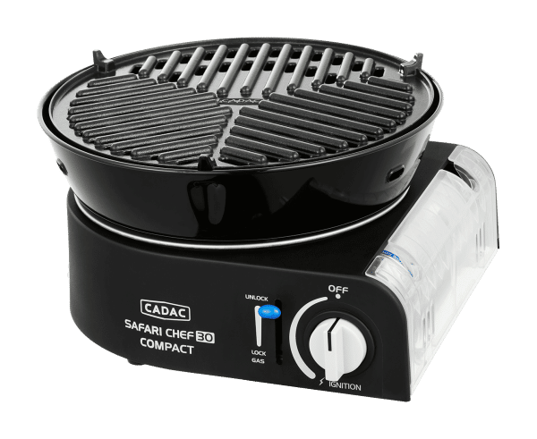 Der neue Safari Chef 30 Compact ist ein ultrakompakter und leichter Gasgrill. Er wird direkt mit einer 227-g-Gaskartusche betrieben. Einfach die Gaskartusche in das Gerät einsetzen, einklicken – und schon kann das Kochen oder Grillen beginnen. Dank seines kompakten Formats ist er äußerst vielseitig einsetzbar, da er verschiedene Kochflächen bietet: einen Topfständer, eine Grillplatte, einen Grillrost und eine Pfanne (Deckel). Auf dem Topfständer lassen sich problemlos Suppen oder Nudeln zubereiten. Der Grillrost und die Grillplatte sind mit der GreenGrill-Antihaftbeschichtung von CADAC versehen und eignen sich perfekt zum Braten und Grillen von Fleisch, Fisch und Gemüse. Der Deckel kann auch als Pfanne verwendet werden, was ihn besonders multifunktional macht. Die Auffangschale sammelt Bratrückstände, wenn der Grillrost verwendet wird, und dient gleichzeitig als Windschutz, damit die Flamme nicht erlischt.