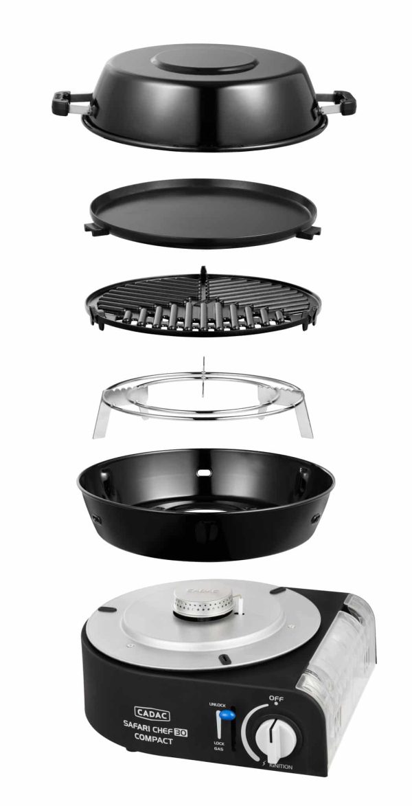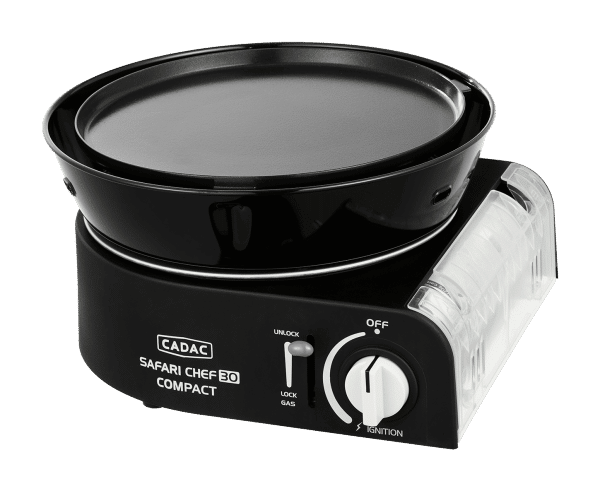 Kompakt, Vielseitig, Leicht. Der Safari Chef 30 Compact ist ein ultrakompakter und leichter Gasgrill, perfekt für Outdoor-Abenteuer und Camping. Er funktioniert direkt mit einer 227g-Gaskartusche, die einfach eingesetzt und per Klick befestigt wird – schon kann das Grillvergnügen beginnen! Vielseitige Kochmöglichkeiten. Topfhalter – Ideal zum Kochen von Suppen oder Nudeln. Grillrost & Plancha-Platte – Perfekt zum Braten von Fleisch, Fisch und Gemüse. Deckel mit Doppelfunktion – Kann auch als Kochpfanne verwendet werden. Fettauffangschale – Fängt Grillrückstände auf & dient als Windschutz. Technische Details. Durchmesser: 30 cm. Gewicht: 3,8 kg. Zündung: Automatische Piezo-Zündung. Betrieb: 227g-Gaskartusche. Material: Antihaftbeschichtung GreenGrill von CADAC. Inklusive: Transporttasche für einfaches Verstauen. 2 Jahre Garantie. Der Safari Chef 30 Compact ist die perfekte Wahl für alle, die auch unterwegs lecker und flexibel kochen möchten!