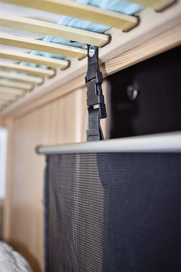 Rausfallschutz / Sicherheitsnetz für Kinder im Stockbett, Hubbett oder Alkoven. Netzhöhe 50 cm mit verschiebbaren, variablen Befestigungsgurten zur Montage in jedem Fahrzeug. Optimale Durchsicht für Kinder und Eltern. Einfach sicher schlafen!