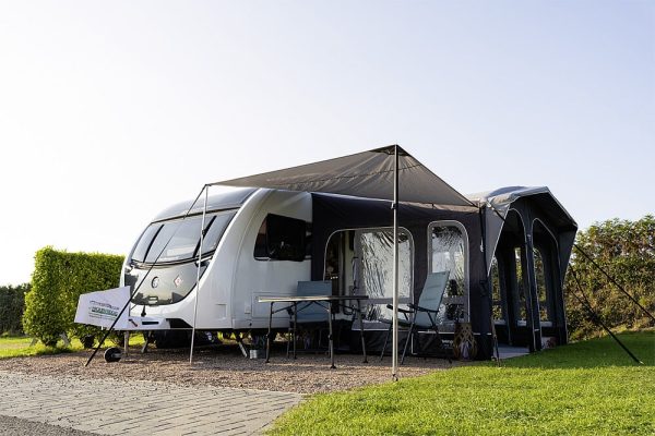Dieser Sonnensegel aus Elements-Shield-Gewebe wird seitlich an den Vorzelten der Vango-Kollektion angebracht und erschafft somit einen schattigen Bereich, noch innerhalb der Parzelle.