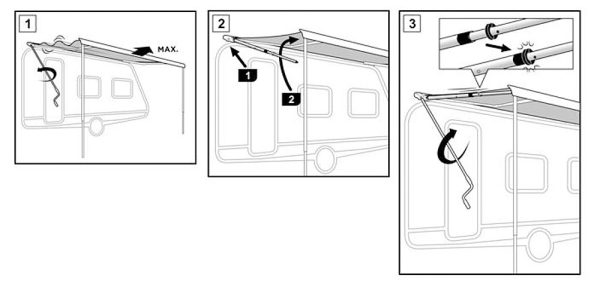 • Das Anbringen ist ganz einfach: Die Markise öffnen, die Spannstange in die Markise einsetzen und das Markisentuch wieder etwas aufrollen, bis die Spannstange fest sitzt