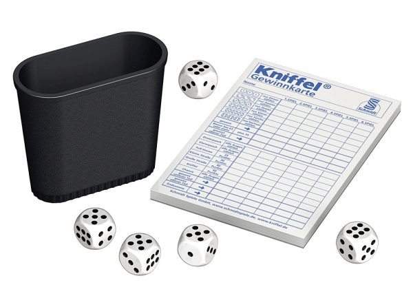 Alles drin ohne viel Drumherum. Mit Würfeln, einem Becher und einem Block ist hier alles zum Kniffeln bereit. Und das in der schönen Metalldose.