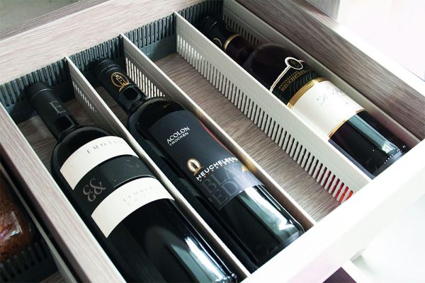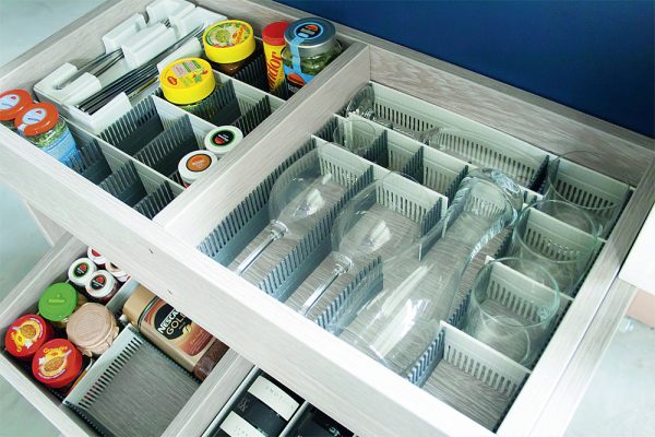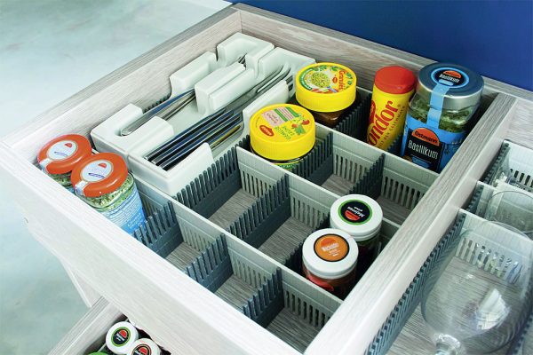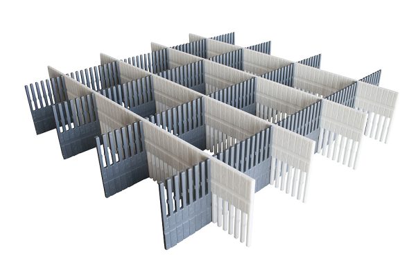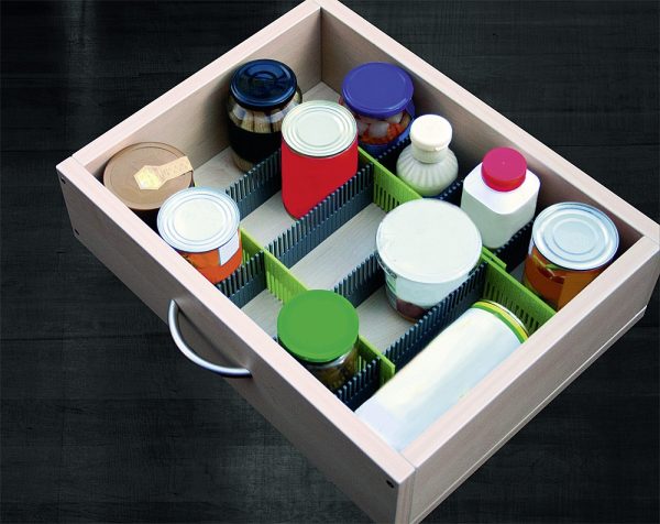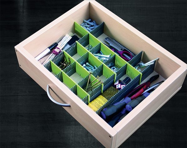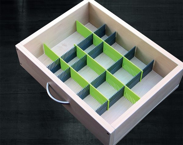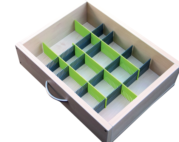 Das Stecksystem besteht aus 8 Stauleisten, die einen variablen Facheinsatz ergeben. Die Längs- und Breitstege aus flexiblem Kunststoff bieten optimalen Trennschutz für verschiedene Artikel und stabilisieren dadurch ihre Gegenstände bruchsicher und rutschfest. An der oberen Längsseite einer Stauleiste befinden sich viele Zinken, die durch einfaches Zusammenstecken eine stabile und feste Verbindung ergeben. Die enge Rasterung der Zinken ermöglicht eine flexible Verstellbarkeit auf fast jeden Abstand.