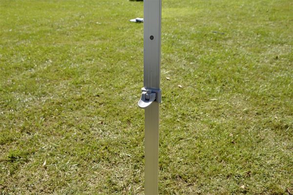 - Minutenschneller Auf- und Abbau – Stützbeine und Spannstangen werden aus der Frontleiste ausgeklappt