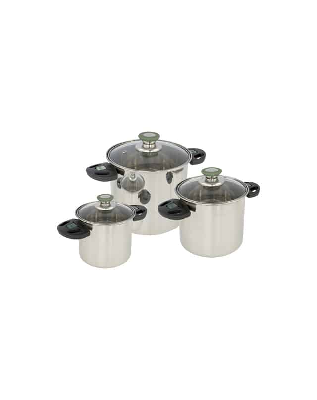 Ein luxuriöses 3-teiliges Edelstahl-Topfset. Jede Pfanne hat einen Deckel mit hitzebeständigem Knauf. Zusätzlich hat jede Pfanne einen hitzebeständigen Umleggriffe. Nach Gebrauch können diese Handgriffe einfach umgeklappt werden, so dass die Pfannen platzsparend gestapelt und verstaut werden können. Spart bis zu 40% Platz! Die Töpfe sind schmal und hoch und daher ideal für den begrenzten Raum auf Gas-Ringen geeignet. Kann mit Wärmequellen aus Gas, Strom und Keramik verwendet werden. Maße (Ø x H): 12 x 11, 16 x 15 und 20 x 19 cm. Fassungsvermögen: 1,25; 3 und 6 Liter.