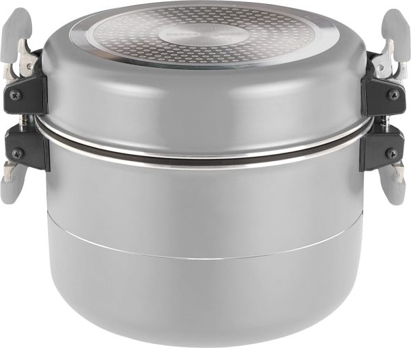 Neu entwickeltes Griff- und Verbindungssystem, das durch die Verwendung von abklappbaren Griffen mit integriertem Magnetelement eine deutliche Verringerung des Packmaßes der Topfsets ermöglicht und zudem die Verwendung eines Zurrgurtes zur Stabilisierung von Topf und Pfanne während des Transportes unnötig macht.