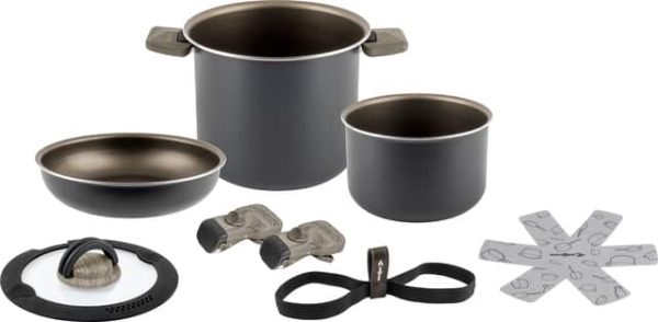 | Lieferumfang | 3x Töpfe, Pfanne, Messbecher, 2x Deckel, 2x Griffe, 2x Topfschutz, Topfhalteband |