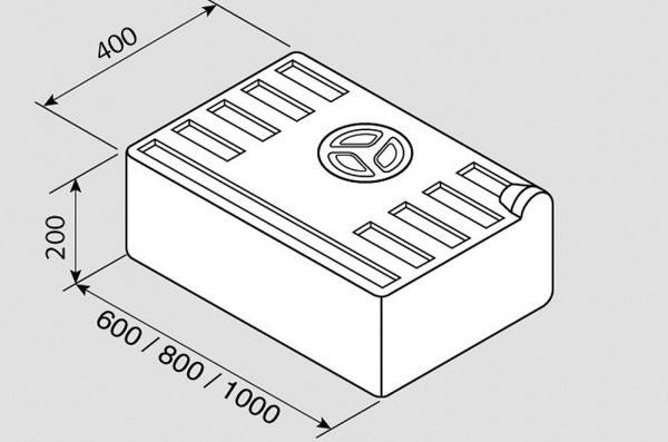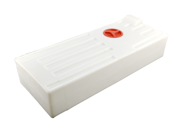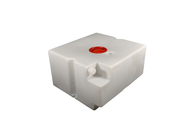 Wassertank mit Reinigungsöffnung ภ12 cm und Entleerungssumpf. Oberseite verrippt zur Aussteifung bei hängender Montage.