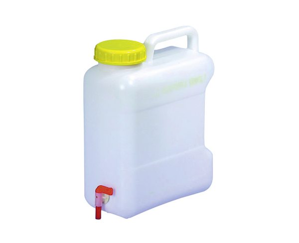 Bidon à col large avec poignée intégrée, bouchon DIN 96, filetage ¾”, robinet de vidange et deux supports de bouchon.
