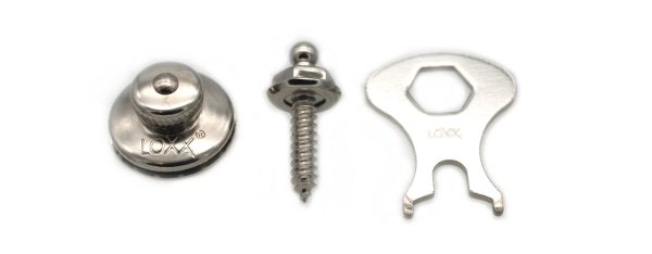 Système de fermeture Loxx composé de 2 parties supérieures (petit bouton), 2 vis longueur 16 mm et 1 clé nickelée.