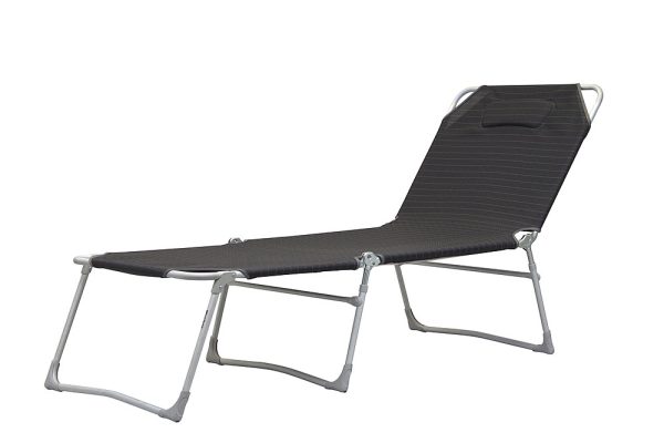 Chaise longue trois pieds, robuste et confortable, en matériau DuraDore avec articulations métalliques et cadre en aluminium rigide. La position couchée la plus élevée facilite l’allongement et se lève énormément. La surface de couchage extra large offre un confort de couchage optimal.