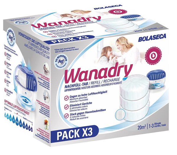 Déshumidificateur, recharge avec 3 tablettes de 450 g. Avec ions d’argent : dernière technologie pour éliminer les odeurs.