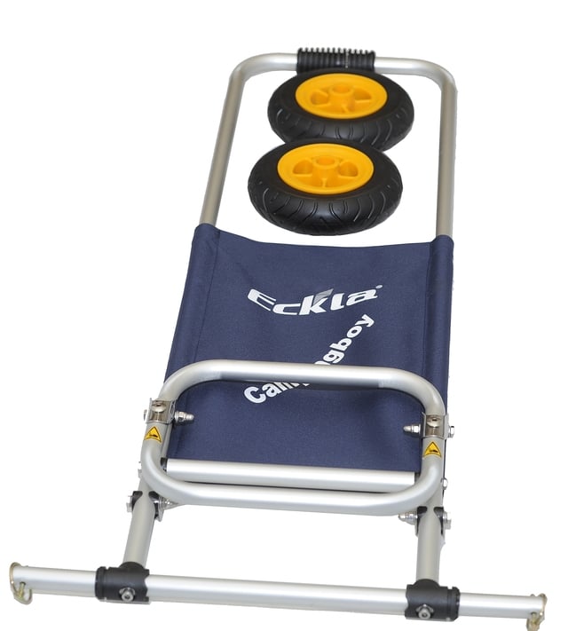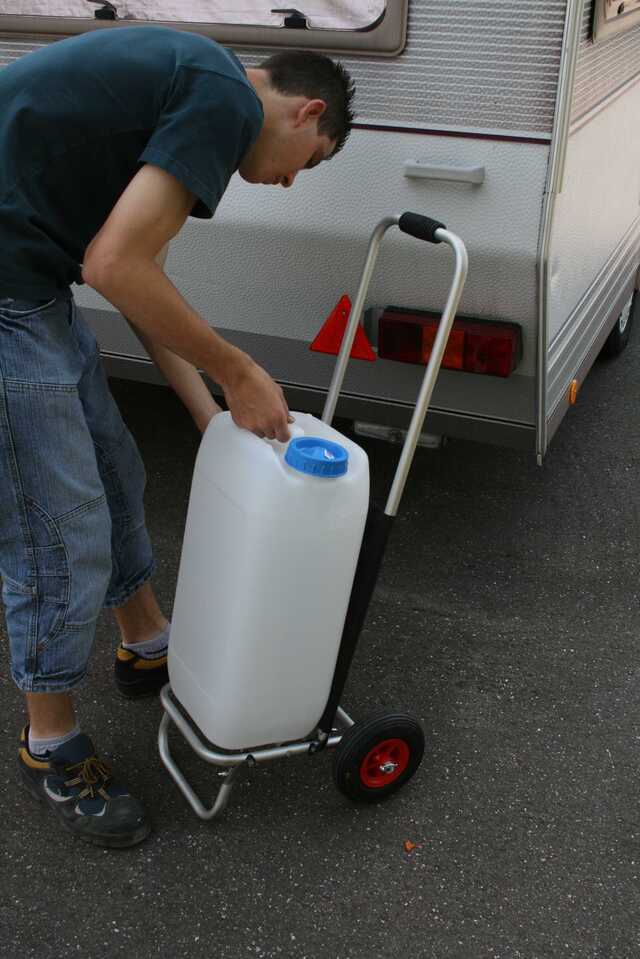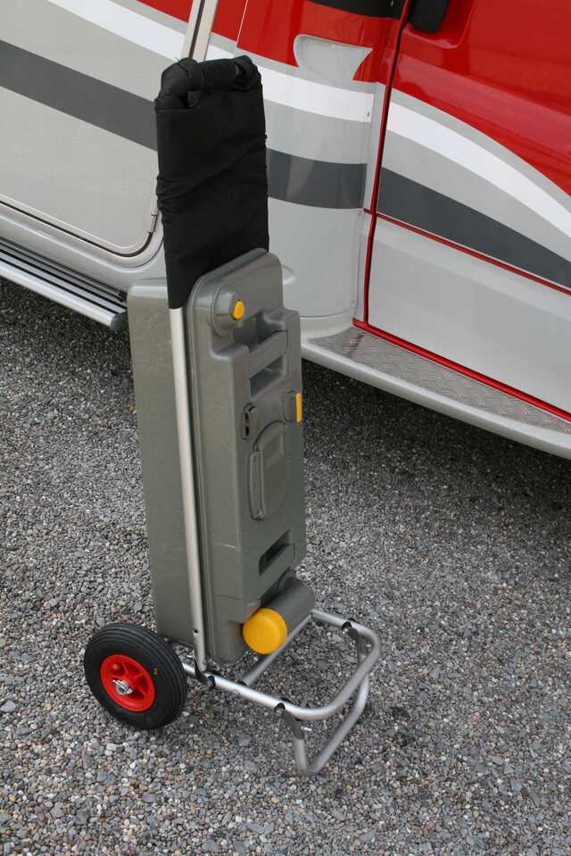 Le Campingboy ECKLA a été spécialement conçu pour le camping lourd et les loisirs. Ses dimensions sont adaptées aux bouteilles de gaz, aux réservoirs d’eau et aux cassettes Thetford C2-C4 et C 200 très utilisées. Les cassettes sont simplement insérées sans être serrées, tout comme les bouteilles de gaz (11kg Ø 300mm). Seule la toile arrière est relevée pour que la cassette et la bouteille de gaz soient bien positionnées. Pour toutes les autres marchandises transportées, comme les réservoirs d’eau et d’eaux usées, ou pour l’utilisation comme chariot de supermarché, l’entoilage reste en bas. Le chariot est équipé de roues de Ø 200 mm pour un déplacement en douceur. Les roues s’enlèvent rapidement grâce à des fermetures rapides. Le Campingboy léger est fabriqué en tube d’aluminium anodisé à paroi épaisse. Fabriqué en Allemagne.