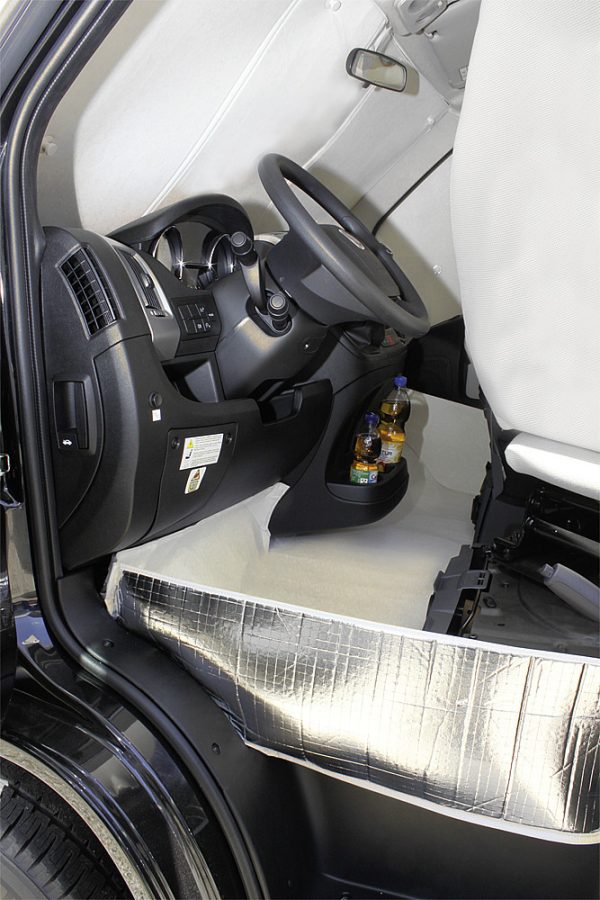 Un complément efficace au rideau thermique. Exactement comme ce dernier, les tapis de séparation isolent contre les rayonnements du froid et les pertes de chaleur dans l’espace pour les pieds. Pour la zone des pieds située sous le tableau de bord et le plancher de la cabine entre les sièges. Grâce à la forme tridimensionnelle en forme de cuvette, l’isolation se ferme hermétiquement dans la zone des portes de la cabine et empêche la pénétration des courants d’air froid au niveau du plancher.