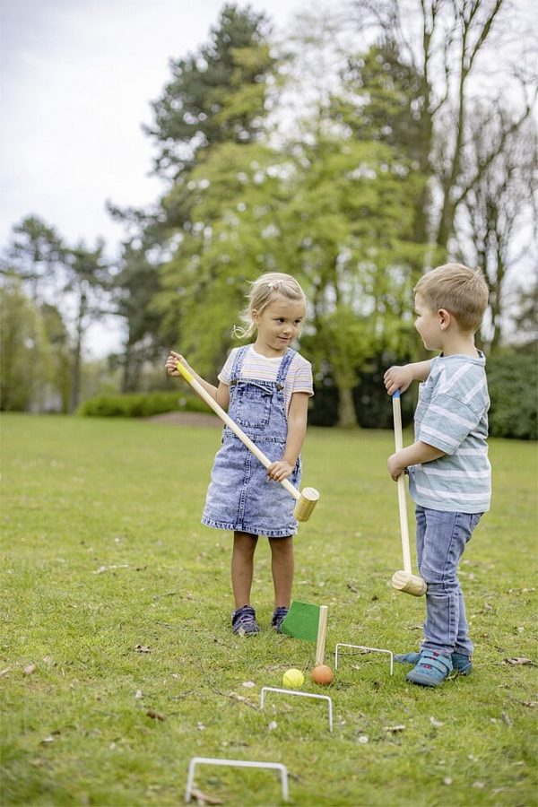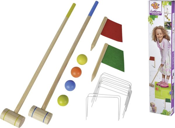 Au jeu de croquet Eichhorn des boules en bois multicolores doivent être frappées à travers des petits arceaux à l’aide de maillets en bois selon une rangée prédéterminée jusqu’à l’arrivée. Le lot inclut deux maillets de 65 cm, 4 boules de 50 mm de diamètre, un poteau de départ et un poteau d’arrivée ainsi que 10 arceaux à dresser. À Pâques, pour un anniversaire ou tout simplement occasionnellement, le jeu de croquet est une idée cadeau parfaite qui offre un grand plaisir de jeu dans tous les jardins et parcs. Le jeu est très léger et se monte rapidement sur la prairie, convient aux enfants dès 3 ans.