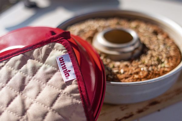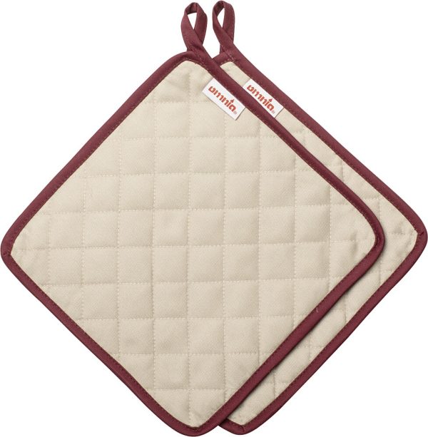 Maniques stylées pour une manipulation simple du couvercle OMNIA et du moule de cuisson. IMPORTANT : Ne pas toucher la partie inférieure en inox avec les maniques !