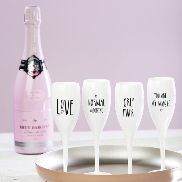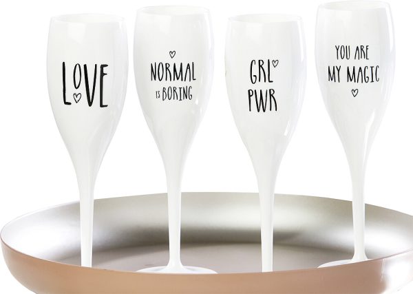 Le matériau de haute qualité isole et maintient les boissons au frais, la forme haute préserve plus longtemps les bulles. De plus, le verre est presque incassable et donc parfait pour une utilisation lors d’événements, dans des clubs, sur la plage, sur le bateau et partout où des morceaux cassés portent moins de chance. 4 motifs imprimés.