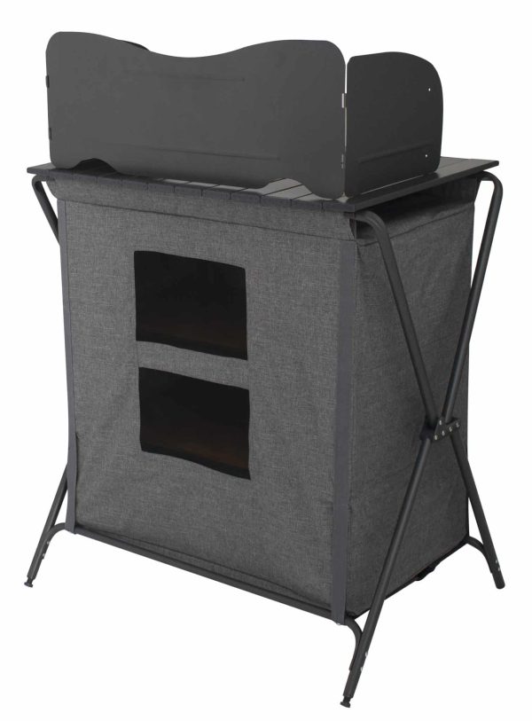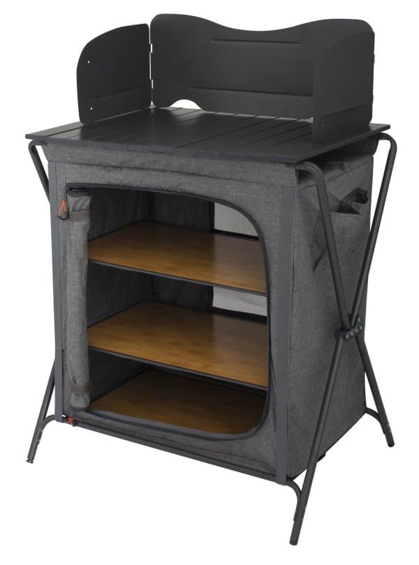 Table de cuisson pliable avec plateau en aluminium et pare-brise. Grand compartiment avec 3 étagères. Le Sava est en polyester et les étagères à 3 étages sont en bambou et, avec le dessus et le pare-brise noirs, offrent un look luxueux. La face arrière a une partie en mesh pour la ventilation. Le cadre en aluminium est réglable et est livré avec un pare-brise et un sac de rangement.
