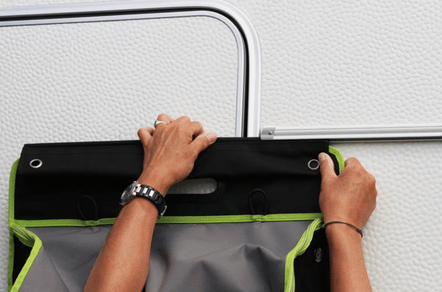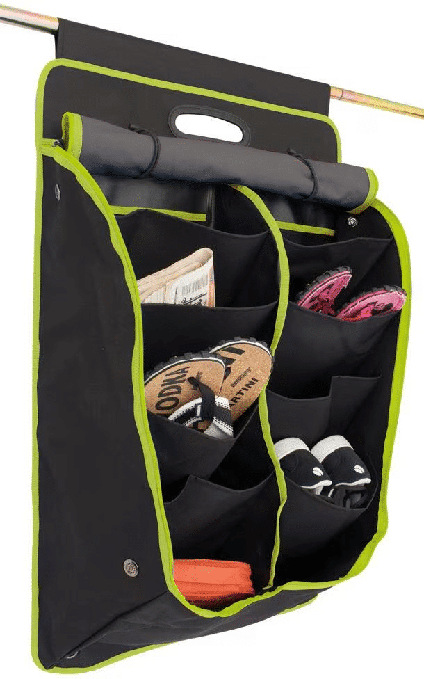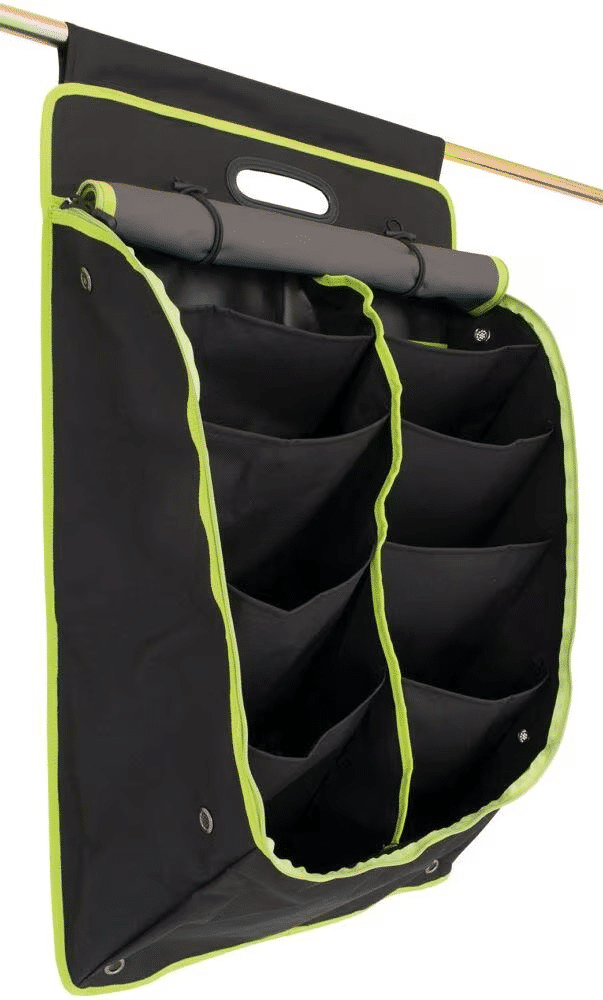 Organiseur très spacieux adapté à toutes sortes d’articles de camping comme les chaussures, les serviettes ou autres vêtements. L’Oxford a un couvercle à fermeture éclair très pratique pour le transport et est équipé d’anneaux de ventilation. L’Oxford a une poignée en plastique solide sur le dessus et peut être fixé de différentes manières ; avec le bourrelet sur le rail de la caravane, avec la fermeture velcro sur un piquet de tente ou avec les œillets pour le suspendre.