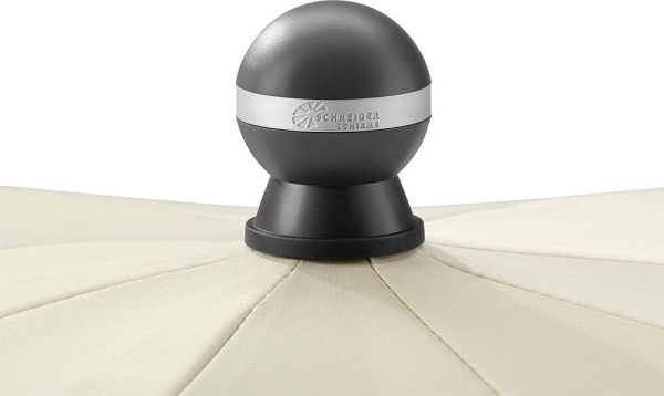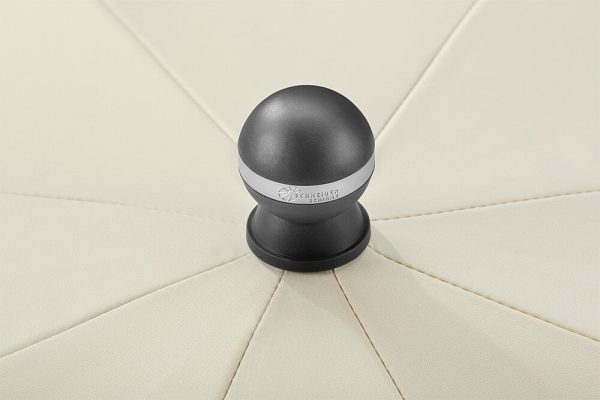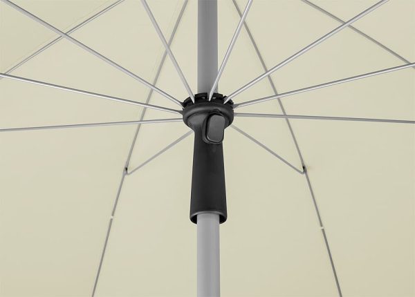 Toile 100 % polyester, env. 160 g/m², imputrescible, imperméabilisée, sans volant, bordure, mât rond env. 220 cm Ø. Armatures peintes par poudrage gris argenté, toutes les pièces en plastique gris anthracite, grand poussoir avec bouton, arrêtoir rotatif, haut boule, tilt d’inclinaison en métal avec bouton à pression, mât en 2 parties Ø 22/25 mm.
