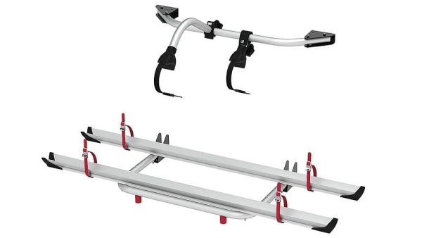 Porte-vélos avec étrier d‘appui pour la fixation au sol et fixations Bike Block à la paroi ou au plafond. Compatible avec le garage arrière d’un camping-car. Convient pour max. 3 vélos