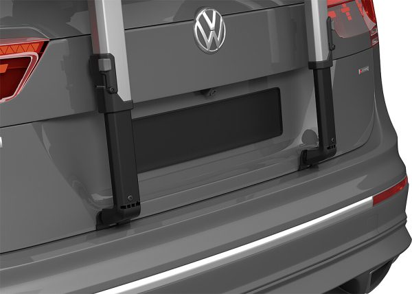 Porte-vélos Thule pour des excursions sans complications, avec plate-forme surélevée laissant les feux arrière et la plaque d’immatriculation visibles.