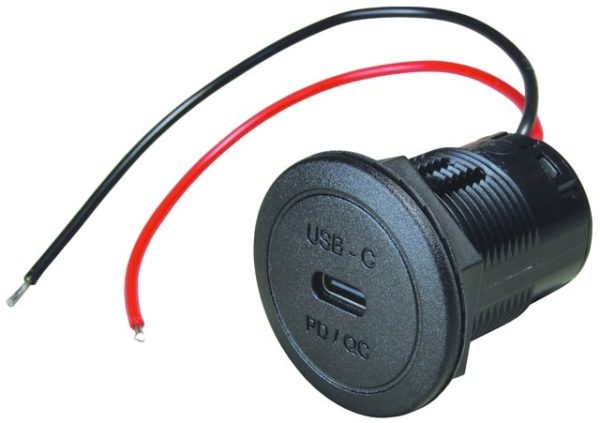 Prise encastrée 12-24 V Power USB-C PD/QC 60 W ; parfaite pour le chargement rapide et mobile de tablettes, d’ordinateurs portables et de smartphones de dernière génération. Avec convertisseur de tension intégré et convertisseur step-up : supporte les méthodes de charge rapide Power Delivery, Quick Charge, PPS, etc. Raccordement de câble env. 150 mm, 2 x 0,5 mm². Épaisseur du panneau 2-16 mm. Trou de montage Ø 28 mm, fixation au moyen d’un écrou hexagonal, sortie : 5 – 20 V, max. 60 W / 3 A ; consommation propre < 5 mA.