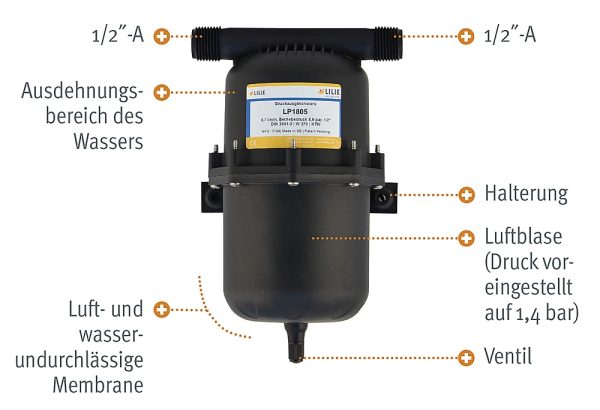Pour un prélèvement d’eau tout confort. Une bulle d’air à pression constante est entourée d’une membrane souple. La pression de la bulle d’air est préréglée à 1,4 bar et peut être modifiée avec une pompe à vélo. Fonctionnement optimal si cette valeur est proche de la pression de redémarrage de la pompe.