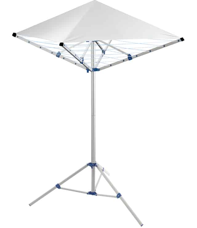 La collection d’étendoirs à linge Brunner s’enrichit d’une nouvelle variante : un modèle à 4 bras avec une bâche de protection pratique en polyester qui offre une protection efficace contre les sécrétions des arbres, les fientes d’oiseaux et les pluies légères et qui permet de garder les vêtements fraîchement lavés propres et impeccables. Elle se fixe facilement à l’étendoir à linge et protège votre linge rapidement et confortablement en cas de besoin. Construction stable et robuste en aluminium avec sac de transport.