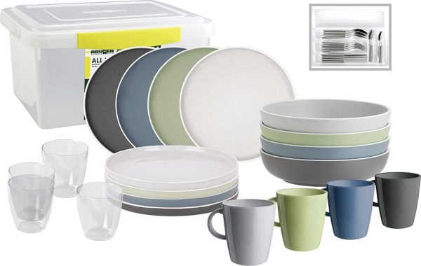 Le service de table ALL INCLUSIVE DOLOMIT est un service de table en mélamine de 36 pièces de haute qualité avec une boîte de transport pratique qui contient tout ce dont vous avez besoin à table :