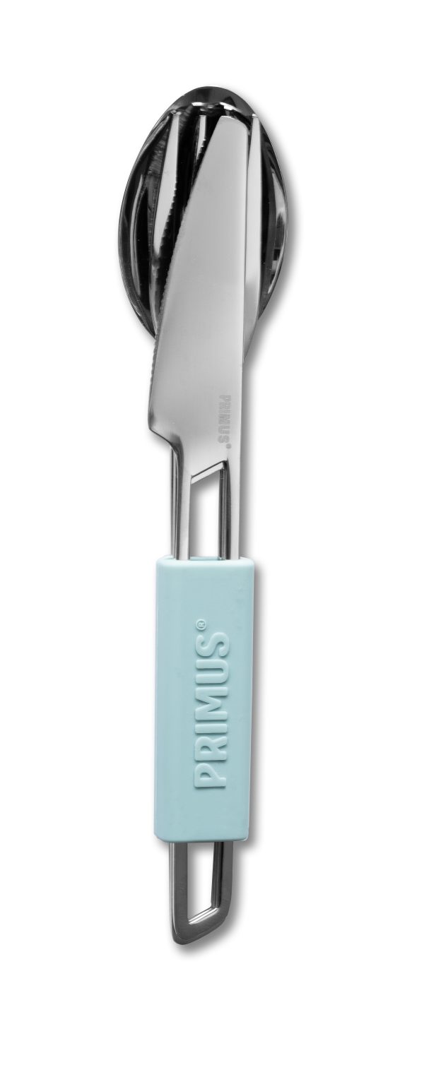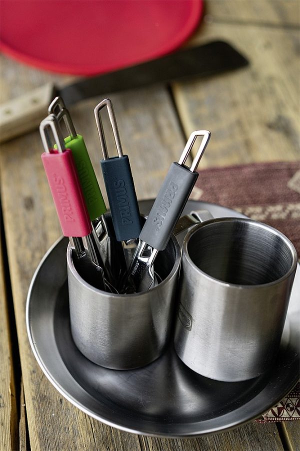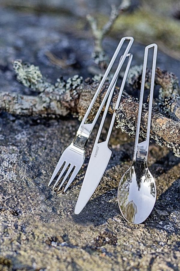 Set de couverts avec cuillère, couteau et fourchette en acier inoxydable de haute qualité et dans un nouveau design. Pendant le transport, un anneau en silicone thermorésistant et antidérapant maintient les couverts ensemble.