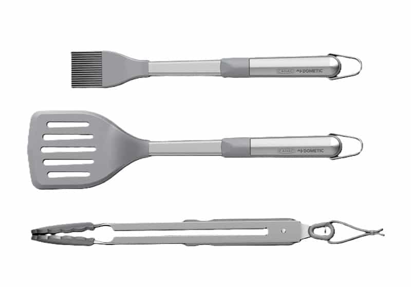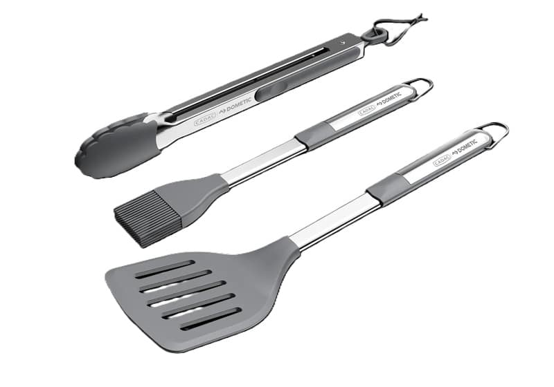Ensemble d’ustensiles premium. Pinces à barbecue, spatule et brosse à badigeon. Acier inoxydable durable avec poignées ergonomiques. Résistant à la chaleur et sûr. Silicone de qualité alimentaire. Idéal pour une utilisation sur le revêtement CADAC GreenGrill.