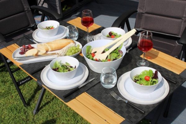 Ensemble de vaisselle de 16 pièces. en 100% mélamine avec un imprimé marbré original et tendance. La qualité de la mélamine robuste, le design original en marbre et la forme moderne des assiettes confèrent à l’ensemble un aspect de haute qualité. Convient non seulement pour le camping mais aussi dans le jardin !