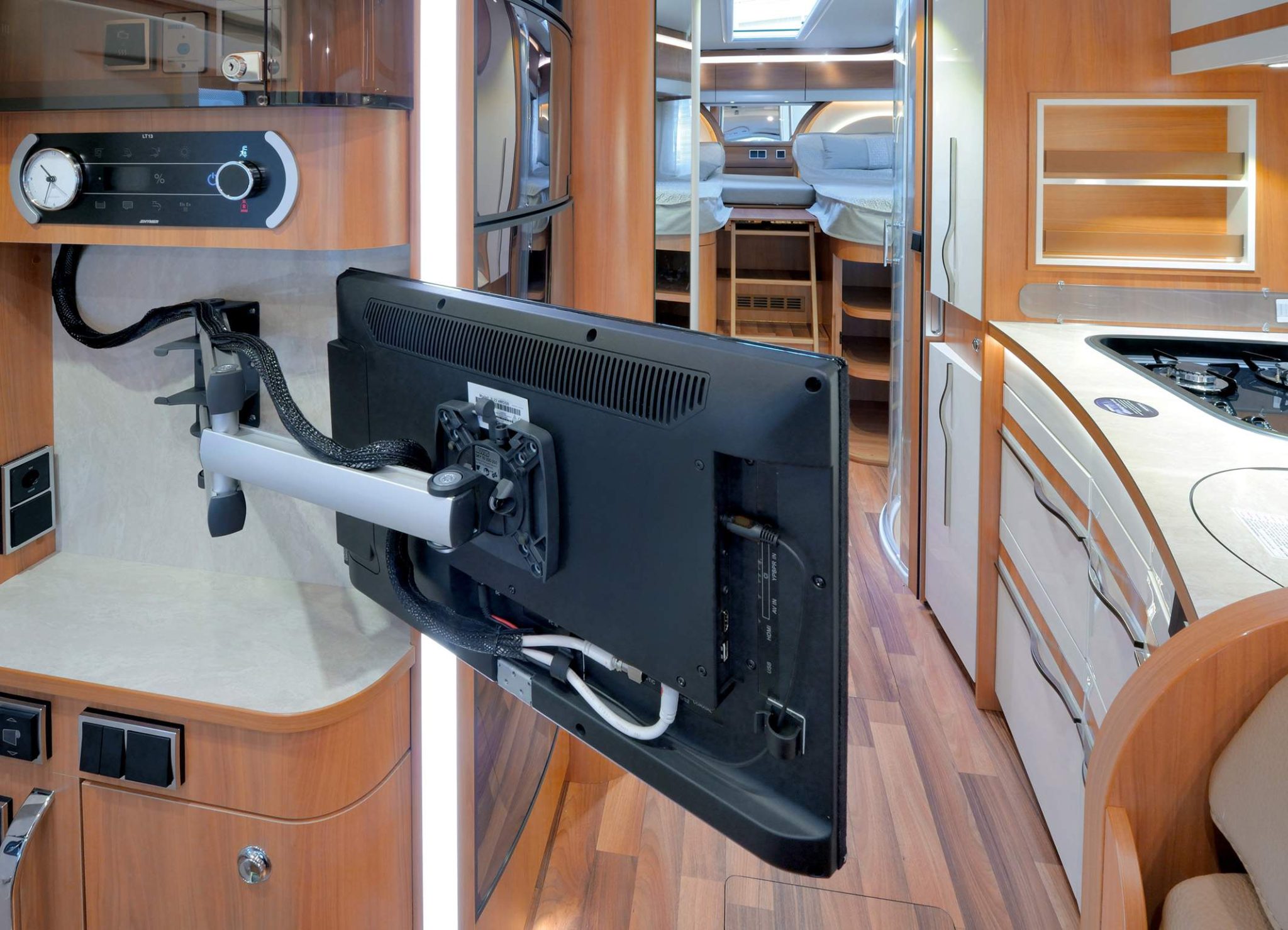 Double articulation avec blocage en position 0 pour protéger l‘écran et platine dé-verrouillable pour désinstaller rapidement et facilement l’écran.