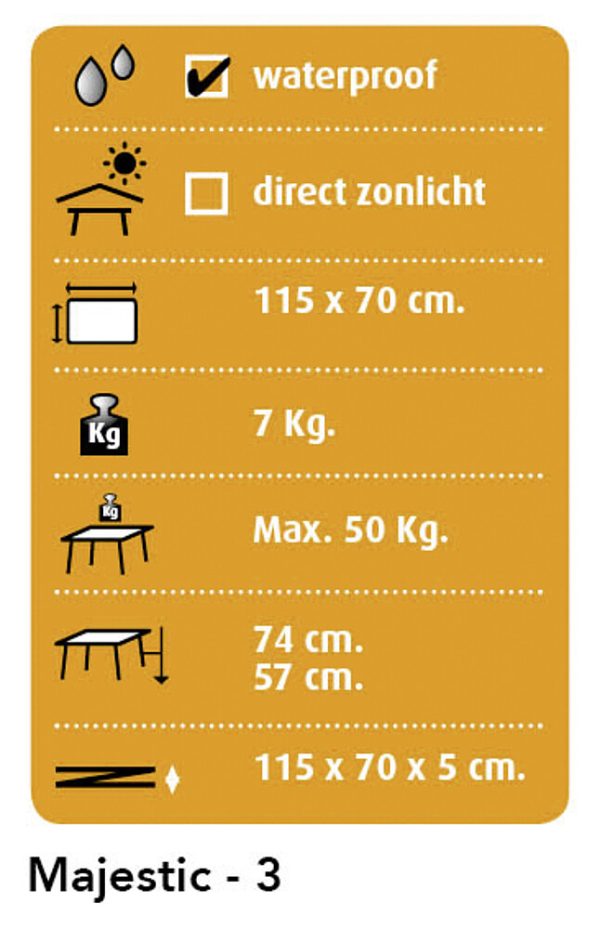 Table ultra-légère, stable et pliable avec un plateau résistant aux intempéries et une armature en aluminium anodisé. Chaque pied est réglable séparément pour que la table soit très stable sur toutes les surfaces. Réglable en hauteur entre 57 – 74 cm.