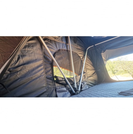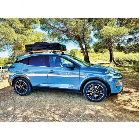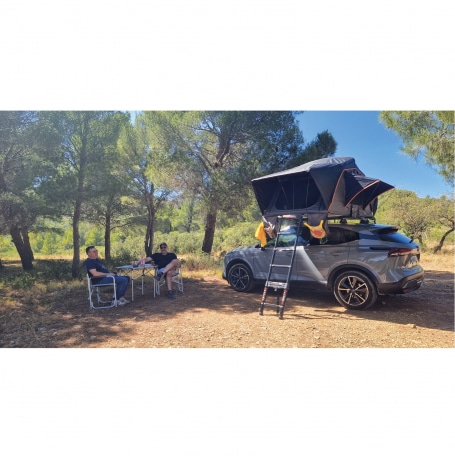 CONCEPTION ET MATÉRIAUX. La toile principale est réalisée en polycoton avec un grammage de 320 g/m² et une enduction PU 3000 mm. Une protection pluie intégrée en polyester 160 g/m² avec une enduction PU 10000 mm renforce l’étanchéité. Une bâche de protection en PVC est incluse. La toile est de couleur grise et la protection pluie est noire. COUCHAGE ET AÉRATION. Le couchage mesure 130 x 220 cm et accueille deux personnes. L’intérieur est conçu avec un tissu respirant et intègre des moustiquaires. Le matelas est en mousse haute densité de 3,5 cm. Sa housse est déhoussable. DIMENSIONS, ACCÈS ET INSTALLATION. Une fois fermée, la tente mesure 110 cm de long, 130 cm de large et 32cm de haut. En position ouverte, ses dimensions sont de 220 x 130 x 125 cm. L’accès se fait par une échelle télescopique en aluminium réglable jusqu’à 230 cm. Le poids net de la tente est de 58,8 kg.