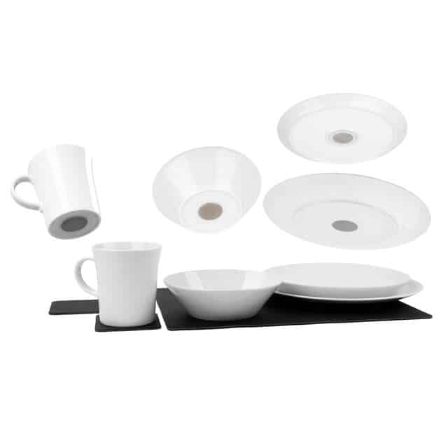 Contient  2 x assiettes à manger, 2 x assiettes à dessert, 2 x assiettes à soupe, 2 x gobelets à anse, 3 x dessous de plat magnétiques Nano Gel